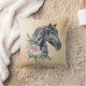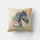 Travesseiro com uma bela ilustração de uma cabeça de cavalo preto com um rico de embelezamento floral ao lado do pescoço. Pintura de animais elegante e elegante. O plano de fundo tem um design abstrato de rico em uma cor amarela clara com marcas de ouro falsas.