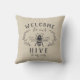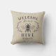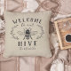 Bem-vindos convidados com este travesseiro decorativo de tema de abelhas bonitinho, com uma ilustração de melada do estilo vintage, enfeitiçada com detalhes de folha botânica. "Bem-vindos à nossa colmeia" aparece em cartazes de carvão. Personalize com o seu nome de família na parte inferior.