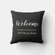 Este travesseiro preto ao ar livre tem a palavra Bem-vindo em um roteiro branco. Uma linha branca horizontal está em Bem-vindo. Você pode editar o texto para o endereço de rua que está embaixo da linha.