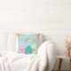 Este design colorido apresenta o teste "Primavera" com um pássaro e decorações de ovo de Páscoa. A parte de trás da almofada tem listras laranja e azul.