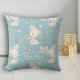Um adorável coelho branco segura uma flor rosa no padrão deste travesseiro de berço. Perto da parte inferior há um oval com o nome do bebê e a data de nascimento. Tudo está colocado sobre um fundo azul médio. A parte de trás da almofada tem o mesmo padrão sem o oval ou texto. Um presente de chá de bebê fofo!