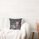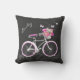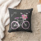 travesseiro decorativo de sotaque na moda feito em uma cinza de quadro, com gráficos de uma bicicleta branca e rosa de uma menina, com uma cesta segurando flores coloridas, com borboletas e sotaques suaves. A parte de trás do travesseiro tem uma cinza, um padrão branco e listrado rosa. Personalize o texto branco, na frente, para você mesmo ou como uma ideia de presente de excelente.