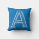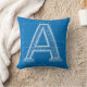 A detailed blueprint-style illustration of the letter "A" is presented against a vibrant blue background. The letter itself is rendered in white, with intricate details and precise measurements indicated by thin white lines. The back of the pillow includes a blue outline of the letter A set against a textured light beige background with a 4-line poem about the letter below.