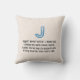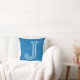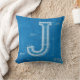 A detailed blueprint-style illustration of the letter J is presented against a vibrant blue background. The letter itself is rendered in white, with intricate details and precise measurements indicated by thin white lines. The back of the pillow includes a blue outline of the letter J set against a textured light beige background with a 4-line poem about the letter below.