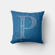 A detailed blueprint-style illustration of the letter P is presented against a vibrant blue background. The letter itself is rendered in white, with intricate details and precise measurements indicated by thin white lines. The back of the pillow includes a blue outline of the letter P set against a textured light beige background with a 4-line poem about the letter below.