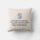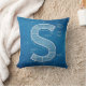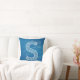 A detailed blueprint-style illustration of the letter S is presented against a vibrant blue background. The letter itself is rendered in white, with intricate details and precise measurements indicated by thin white lines. The back of the pillow includes a blue outline of the letter S set against a textured light beige background with a 4-line poem about the letter below.