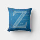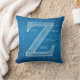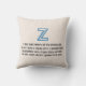 A detailed blueprint-style illustration of the letter Z is presented against a vibrant blue background. The letter itself is rendered in white, with intricate details and precise measurements indicated by thin white lines. The back of the pillow includes a blue outline of the letter Z set against a textured light beige background with a 4-line poem about the letter below.