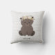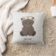 Um travesseiro com um design com o tema da floresta, ilustrando um urso bebê sobre um fundo de madeira de cinza. Personalize o nome. O urso está vestindo uma coroa de flores.