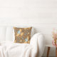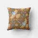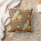 Este travesseiro decorativo apresenta um padrão de imagens de pássaros azuis no estilo de bico, designs cardíacos, folhas e flores em fundo marrom profundo. As cores usadas nas imagens incluem bronzeado, azul claro e ouro. Ambos os lados do travesseiro têm o mesmo padrão.