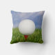 Feche uma bola de golfe branca numa colmeia vermelha na grama verde com fundo do céu. O texto é editável.