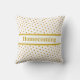 Travesseiro decorativo com belas bolinhas metálicas douradas sobre fundo branco. O regresso a casa pode ser personalizado. Casa e família são o nosso verdadeiro tesouro!