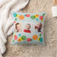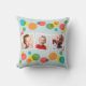 Crie uma coloração e divirta-se com a decoração da festa de aniversário ao mesmo tempo. Este travesseiro decorativo está pronto para ser personalizado com três das suas fotos favoritas. (As fotos em formato quadrado funcionarão melhor.) Suas fotos são colocadas sobre um fundo azul claro, acentuado com bolinhas coloridas em azul, amarelo, verde, vermelho e laranja. Há um padrão de bolinhas coordenado no lado oposto.