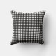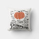 Este travesseiro ao estilo da fazenda apresenta um design de abóbora com as palavras "Fazenda Fresca de Abóbora". Na parte de trás está um padrão de gingham preto e branco.