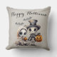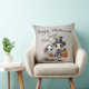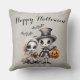 Este travesseiro decorativo de Halloween apresenta uma ilustração do estilo de desenho animado fofo e assustador. Uma imagem de um esqueleto de menino vestindo um chapéu de cima e jaqueta de terno, e uma boneca de porcelana de menina fantasma são fotografadas no fundo. Dois morcegos giros voam sobre suas cabeças enquanto carregar suas lanternas pela noite. Uma saudação de "Feliz Dia das Bruxas" é impressa no topo do travesseiro em uma letra elegante. O plano de fundo apresenta um padrão de sombra.
