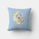 Este travesseiro decorativo personalizado apresenta um lindo coala bebê amaldiçoado dormindo em uma lua crescente com estrelas brilhantes em um fundo azul pastel branco.