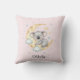 Este travesseiro personalizado apresenta um belo coala bebê amaldiçoado dormindo em uma lua crescente com estrelas brilhantes sobre um fundo branco e pastel, cor-de-rosa macio.