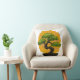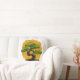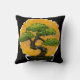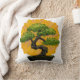 Uma bela ilustração de uma árvore bonsai que se senta num pote preto contra um fundo circular amarelo brilhante.
