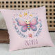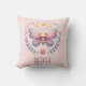 Este travesseiro personalizado e caprichoso apresenta uma borboleta sorridente com asas rosas e cinzas espantosas. um círculo delicado de elementos botânicos rodeia este travesseiro charmoso.
