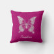 Uma borboleta de diamante branco de classe com nome de script branco em fundo fuchsia profundo.