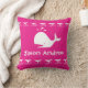 Parte da decoração costeira da praia do oceano. Baleia branca num travesseiro rosa. Menina Náutica Data de nascimento e nome travesseiro personalizado. Design por Sandy Closs.