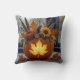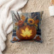 Uma abóbora esculpida exibe uma folha de mapa brilhante, cercada por flores, penas faisões e folhagem de outono, enquanto as folhas caem suavemente das árvores ao fundo