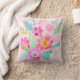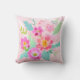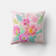 Este travesseiro apresenta um belo e feminino buquê colorido de flores cortadas em tons de rosa, laranja, amarelo e branco, que são complementados com folhas verdes e aqua em um fundo cor-de-rosa macio.