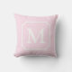 Este design de travesseiro tem um fundo de rosa claro inteiro. No centro está um quadro quadrado branco entalhado com uma inicial de monograma branco.