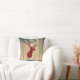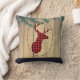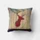 Um travesseiro quadrado com estilo rústico. Projetado com uma cabeça de veado com galhadas, feito de xadrez vermelha. Um quadro oval de rico envolve a imagem. Uma imagem de tábuas de madeira para a imagem de fundo dá-lhe uma sensação de país estranho. A borda inferior tem um padrão azul escuro com galhos e folhas.