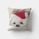 Um travesseiro com uma fotografia adorável de um cãozinho branco giro vestindo um chapéu de natal vermelho.