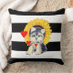 Cãozinho de Yorkshire bonito com corações e girassol sentado em Travesseiro decorativo listrado preto e branco. Cachorro só na frente. Travesseiros decorativos elegantes em casa, preto e branco.