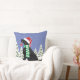 Festivo Natal Black Lab Holiday Dog vestido com chapéu de Santa e cachecol verde e branco segurando enfeites de natal vermelha na boca. Inverno de neve. Travesseiro de natal bonito para amantes de laboratório! © EMR. Designs.