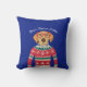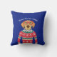 Engraçado travesseiro decorativo azul de Natal, com um cão vestindo óculos vermelhos e um doce nórdico de Natal "Feio". Na verdade, achamos que ele é preferencialmente fofo! Adicione o texto personalizado acima ou exclua. Faz o Natal perfeito e o presente de aniversário de inverno para amantes de cães. Excelente também para festas de natal de elefante branco ou de troca de presentes de Papais noeis secretos.