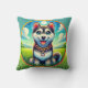 Ilustração adorável de um cachorro feliz com olhos brilhantes e um sorriso agradável, sentado em um prado verde exuberante sob um céu azul ensolarado. Perfeito para conceitos de animais, alegria e natureza.