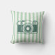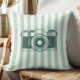 Throw pillow with camera illustration on a green striped background. Perfect for dorm rooms.