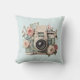 A pillow with a vintage styled camera decorated with flowers. Pastel colors of pink, cream and green.