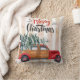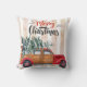 A ilustração colorida da aquarela de férias apresenta caminhão-pirata vermelho e com pano de madeira, com árvore de Natal cortada e fresca, em fundo listrado em apuros. Sobreposição de texto preto/vermelho "Feliz Natal"