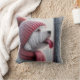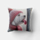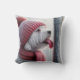 Um cão branco fofo com um chapéu vermelho e cachecol tem a língua presa a um poste de metal gelado