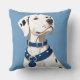 Ilustração estilizada de um cão dalmata usando uma coleira azul contra um fundo azul simples, destacando sua aparência manchada distinta e comportamento amigável.