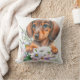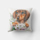 Este lindo design travesseiro apresenta uma adorável aquarela Dachshund cachorrinho, e um arranjo floral com lavandas e flores lindas (principalmente brancas) com um toque de folhagem verde. É moderno e ultra-fofo. Seria um belo presente para um amante de cachorro, mãe de cachorro ou andador de cachorro - especialmente aqueles que amam salsichas / cachorros de salsicha / cachorros!. Um presente único para uma variedade de ocasiões, como um presente 'novo lar', ou para um aniversário, Dia de as mães, Natal ou outra ocasião.