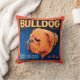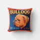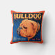 Um impressão de etiqueta de caixa de safra ilustrando um buldogue com um fundo azul padronizado e uma borda laranja. Escolha este impressão de arte no seu produto Zazzle hoje mesmo.