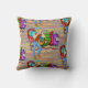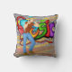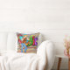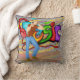 Cara loira com fones de ouvido e um fundo de grafite de música. Um lado do travesseiro tem um impressão grande e o outro lado tem um padrão de repetição menor. Há uma série dessas impressões com caracteres diferentes.