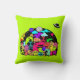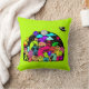 Um travesseiro com um rabisco divertido usando um tema cósmico. Uma reunião de criaturas espaciais alienígenas. Colocado em um design de espaço externo. Vocês podem ver uma lua, planetas, naves de zoom, estrelas e um navio de alienígena chegando para pousar. As cores incluem os pastéis retrorreflectores brilhantes e sutis. Colocado sobre um fundo de verde limão excitante.