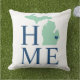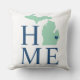 O travesseiro de boas-vindas apresenta o texto "Home" com o mapa do estado de Michigan. O marcador da cidade do coração azul marinho pode ser posicionado sobre a cidade onde você mora via Personalizar. Marinho azul, jade / horta verde e cores brancas. Um padrão de listras horizontais veste a parte de trás do travesseiro.