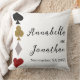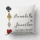 Este travesseiro decorativo personalizado apresenta um tema do cassino de Las Vegas. Os quatro naipes num baralho são impressos à esquerda num padrão horizontal. A pá é um design preto, o clube é ouro, o diamante é prata, e o coração é um design vermelho-brilhante. Os nomes do casal e da data do casamento da amostra são impressos à direita em uma fonte preta elegante.