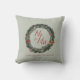 Esta almofada festiva de Natal "Sr. & Sra." com tema de casamento country apresenta ilustrações ocidentais desenhadas à mão de uma coroa de pinheiro com botas de cowboy, chapéu de cowboy, frutos de azevinho, cactos e ornamentos natalinos vintage em tinta preta contra um elegante fundo verde-sage. Personalize com o inicial e nome da sua família para torná-lo exclusivamente seu.