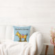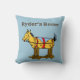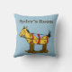 Um travesseiro decorativo editável com seu nome em letras ocidentais, e a arte venenosa restaurada de um cavalo de brinquedo com manchas sobre rodas, restaurada a partir de um livro de histórias.
