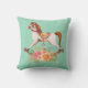 Um travesseiro quadrado com uma imagem charmosa e fantasiosa de um cavalo de balanço antiquado com um buquê floral rico a rosa e amarelo. O fundo é uma cor damasco verde-clara.