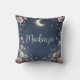This custom throw pillow features a celestial floral garden theme. A border of pretty little flowers frames the pillow, with a glowing crescent moon placed near the top. The background is a dark blue color, resembling the night sky over an enchanted garden. A sample name is printed in the center which you can personalize to include your own custom name or other text.