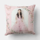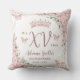 Personalize este elegante travesseiro de aniversário de Quinceañera / Sweet 16 cor de rosa de forma fácil e rápida. Basta clicar no botão Editar Usando Ferramentas de Design para editar ainda mais os textos, alterar as fontes e as cores das fontes. Apresenta belas flores de cerejeira em aquarela, borboletas em rosa dourado e uma moldura geométrica em rosa dourado. Adicione a fotografia da sua quinceanera no verso do travesseiro. Isso torna um lindo souvenir para quinceanera, sweet sixteen, aniversário de 18 anos, baile de debutante e muitas outras ocasiões! Itens correspondentes disponíveis na loja. (c) Somerset Fine Paperie
