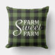 Travesseiro único, elegante e decorativo do estilo fazendeiro, com um texto de citação de Fazenda doce, em uma design de padrão de verificação de tanas de Buffalo Lumberjack Tan, verde e preto.